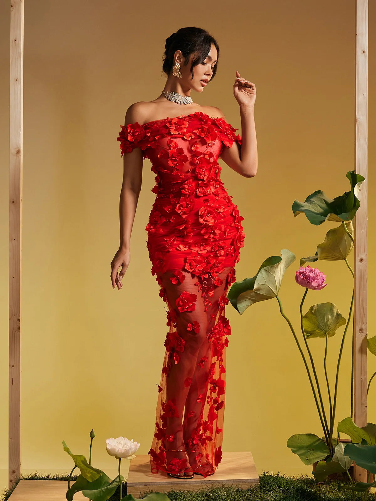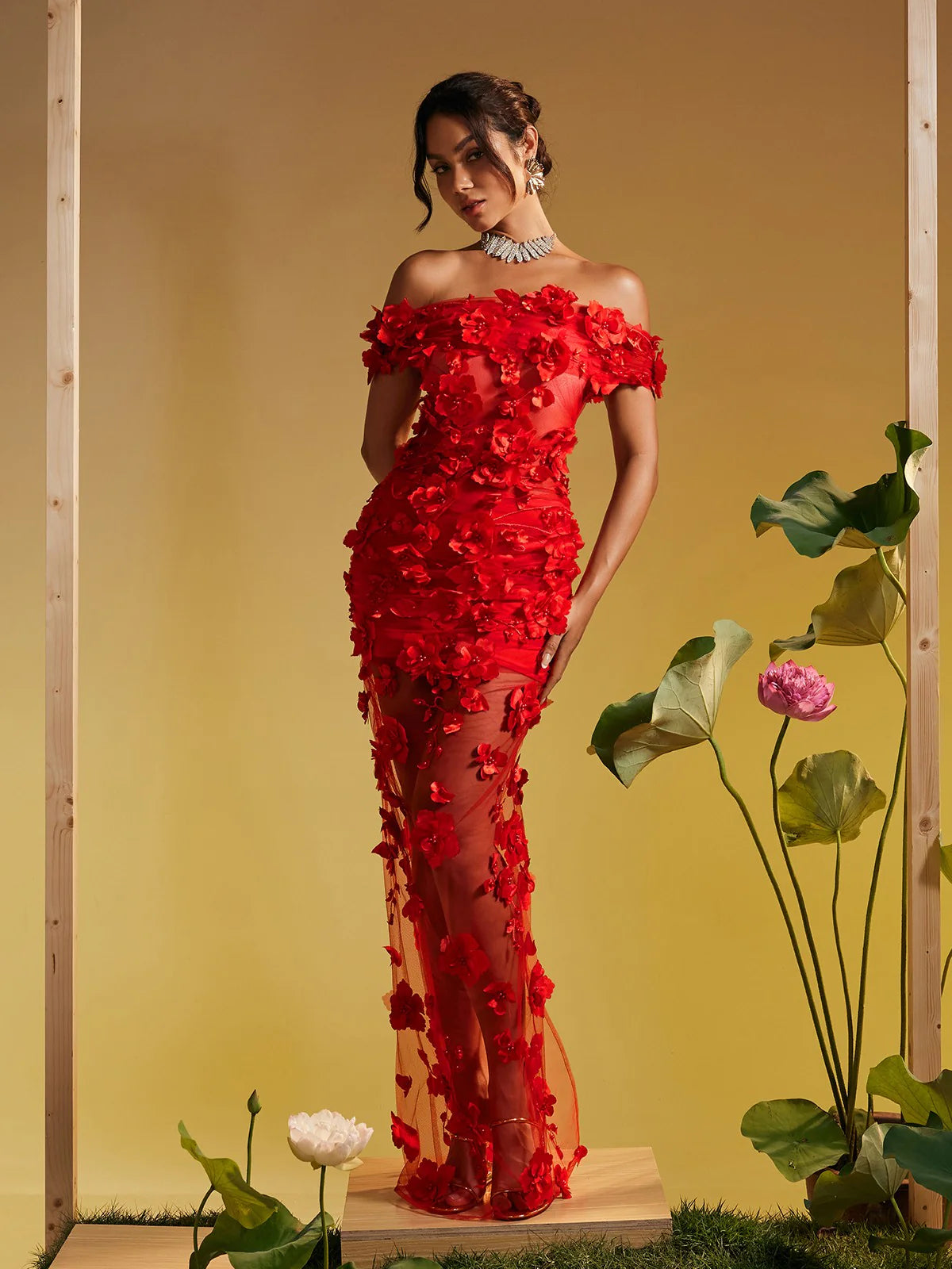 Robe longue en maille fleurie à épaules dénudées Azizi